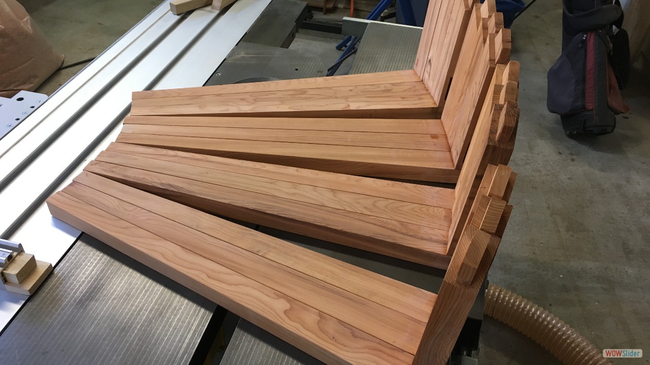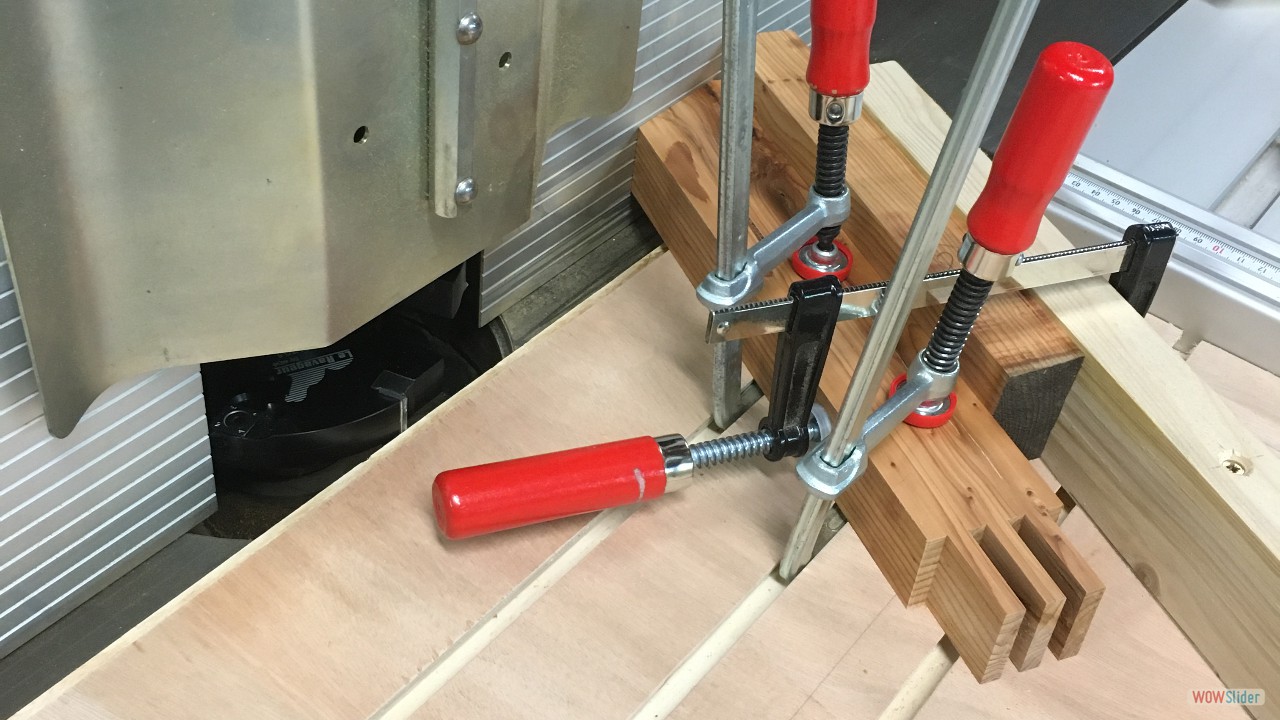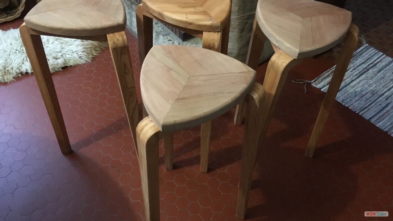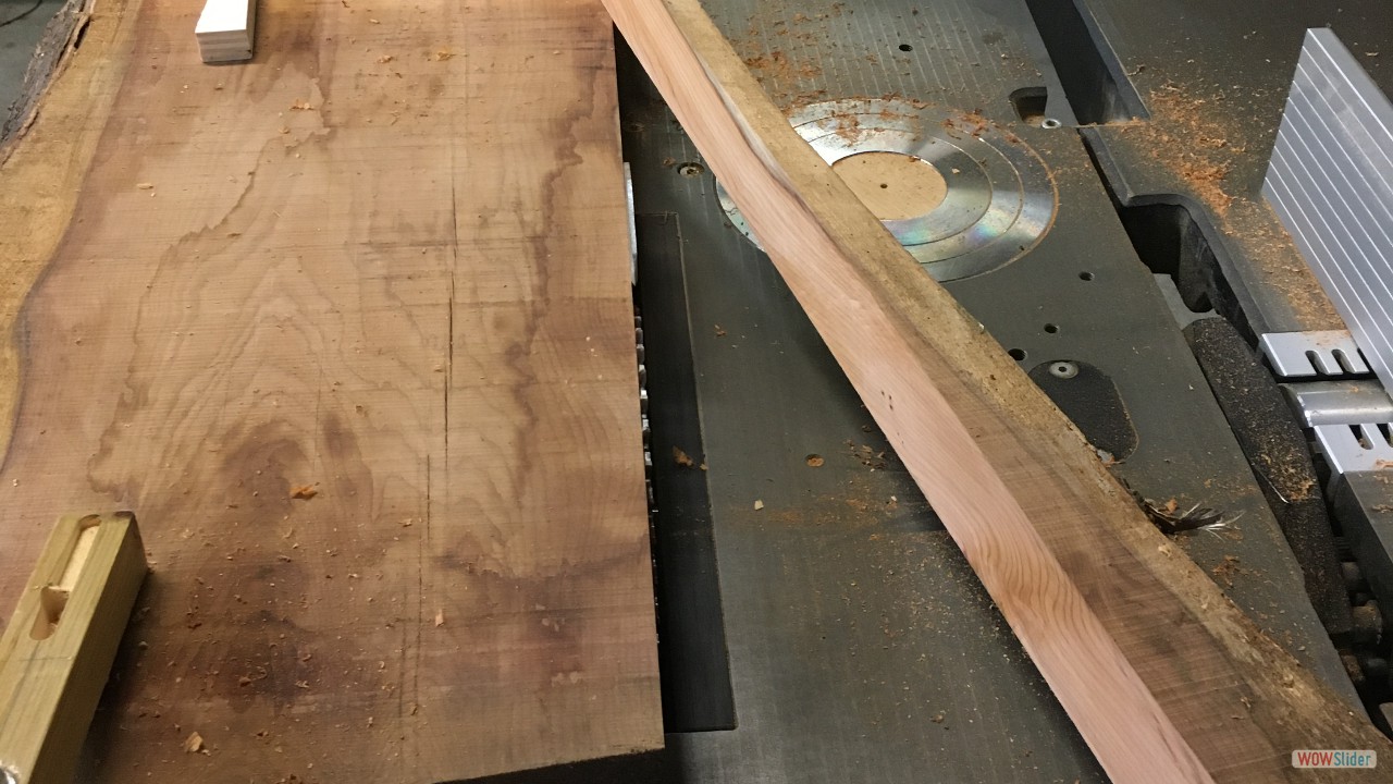 Plateaux d'Orme.1 Plateaux de Cèdre du Liban (De Charente Maritime)2 Plateau d'Orme, 60 ans après la coupe!3 C'est le début du délignage....4 5 6 7 8 9 Les bruts pour les pieds et les assises.10 Débit des pieds et des assises11 Beaucoup de copeaux.....12 13 En sortie de la rabot / dégauchisseuse14 Les assises (trois morceux par assise).15 Montage d'usinage pour l'assemblage avec des dents de scies.16 Phase de collage des assises.17 Les assises sont collées.18 Montage d'usinage pour les rayons sur les assises.19 20 21 Première utilisation du montage d'usinage.22 Autre montage pour faire les rayons des assises.23 5324 5425 Réalisation des enfourchements pour les pieds.26 L'outil sur la toupie pour réaliser les enfourchements.27 Voilà le travail.28 Pour les 4 tabourets.29 Enfourchement pour les traverses.30 31 Gros plan sur la traverse.32 Montage d'usinage pour la mortaise.33 Autre vue.34 La série des traverses pour les 4 tabourets.35 Encore un autre montage d'usinage....36 Juste pour une petite coupe.37 Les 4 assises et les 4 traverses.38 Encore un autre montage pour faire une petite pente de 3°.39 Une petite chute de bois, a faire pour 12 pieds.40 Les pieds et les chutes41 42 Des chutes pour faire.....?43 Collage des pieds sur les traverses.44 Il faut beaucoup de serre-joints.45 Pieds avec traverses.46 47 Montage à blanc...avant collage et avant les rayons.48 Il faut encore faire les arrondis.49 Réalisation des arrondis....12 opérations identiques.50 51 52 53 54 55 56 57 L'outil pour faire les rayons.58 Voilà le résultat, il reste le ponçage....59 Pour le collage il faut encore faire un petit montage.60 61 62 Petites brides pour le serrage.63 Utilisation des brides pour un bon collage.64 Les tabourets s'empillent bien.65 66 Voilà, autre vue d'ensemble.67 Vue de dessus.68 Autre vue de l'empillage des tabourets.69 FIN du diaporama.....A bientôt.70